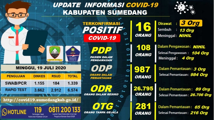 SUMEDANG, — Gugus Tugas Percepatan Penanganan Covid-19 Kabupaten Sumedang kembali melaporkan perkembangan pencegahan penyebaran Covid-19 di Kabupaten Sumedang pada Minggu, 19 Juli 2020 yang masih perlu lebih diwaspadai.