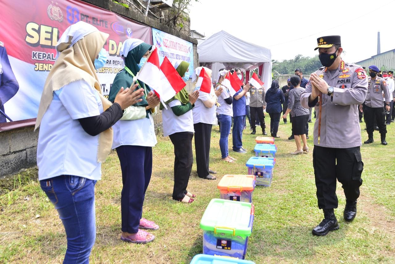 TANGERANG – Usai meninjau serbuan vaksin untuk buruh di PT Elite, Kapolri Jenderal Polisi Listyo Sigit Prabowo memberikan bantuan sosial 1000 paket sembako yang diberikan secara simbolis kepada 5 perwakilan buruh dan masyarakat sekitar, Kamis (19/08).