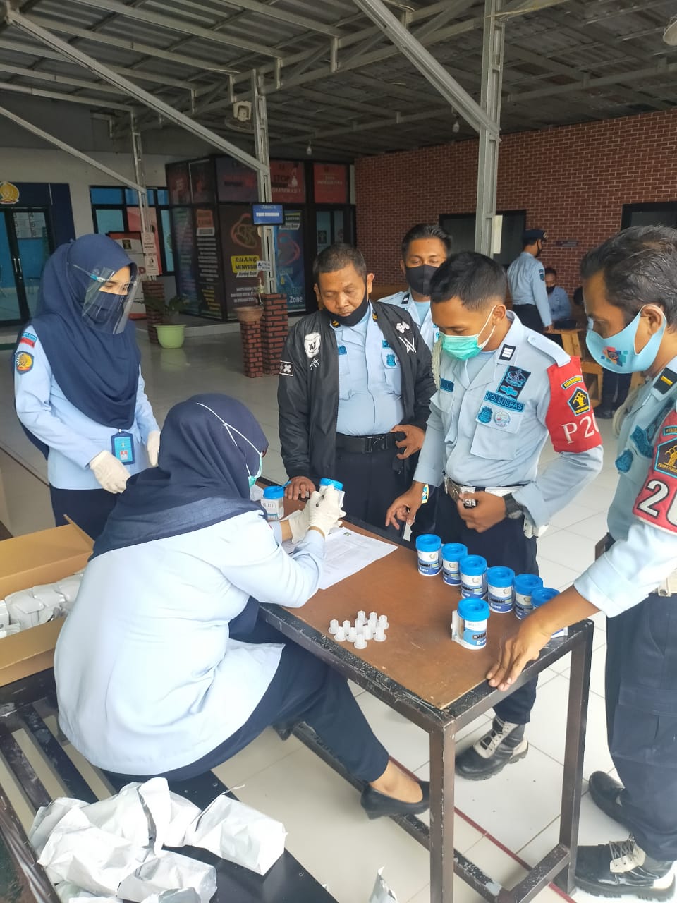 Bertempat Ruang Kunjungan Lapas Serang, Tim Dokter dan Perawat Lapas Kelas IIA Serang melalukan pemeriksaan test urine kepada Petugas Regu Jaga Pengamanan Alpha, Bravo, Charlie dan Delta secara bergiliran.