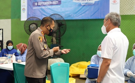 Kapolres Cilegon AKBP Sigit Haryono, S.I.K, SH, menyampaikan hari ini kami melaksanakan pengecekan terhadap pelaksanaan vaksinasi yang diinisiasi oleh teman-teman GRJ dan teman-teman Bela Negara, dimana ini adalah inisiasi yang bagus, artinya dalam elemen masyarakat dari Ormas dan dari siapapun itu ketika mempunyai visi yang sama untuk mensukseskan program Presiden dengan aksorasi vaksinasi, maka kami dari Polres Kota Cilegon mendukung sepenuhnya pelaksanaan vaksinasi di Banten ini.