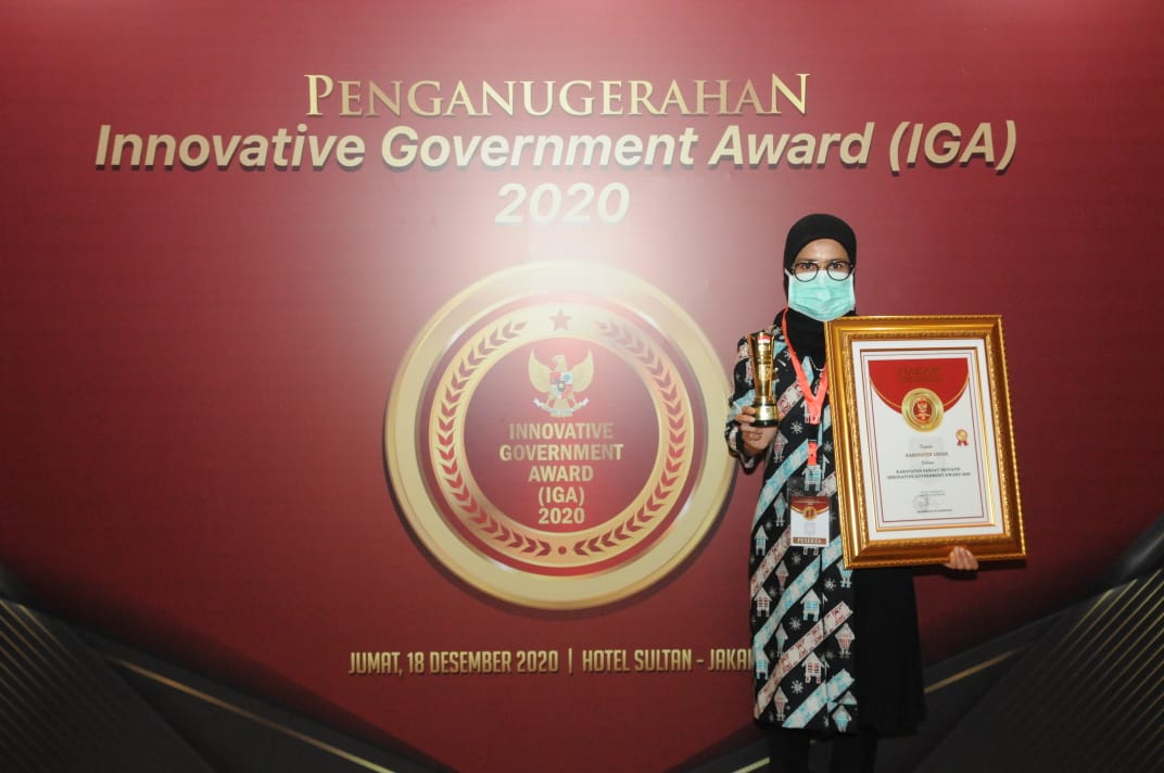 Penghargaan ini diberikan Sekretaris Balitbang Kemendagri RI, Dr Kurniasih, kepada Bupati lebak Iti Octavia Jayabaya pada ajang Innovation Government Award 2020 di Hotel Sultan Jakarta, Jumat (18/12/20) sebagai bentuk apresiasi Pemerintah Pusat kepada Pemerintah Daerah yang telah berupaya melakukan berbagai perubahan dengan inovasi-inovasinya terutama yang berkaitan dengan upaya peningkatan kualitas pelayanan publik.
