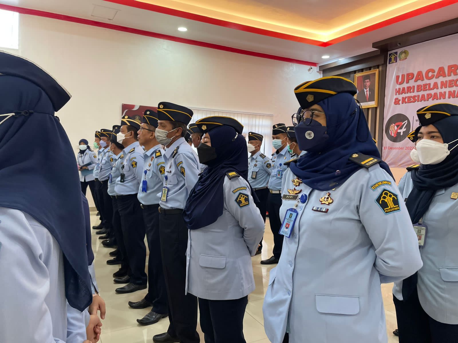 TANGERANG- Lapas Kelas I Tangerang turut mengikuti Upacara Peringatan Hari Bela Negara ke-74 & Kesiapan Nataru 2022/2023 yang diselenggarakan oleh Kementerian Hukum Dan Hak Asasi Manusia secara daring di aula Dalam Lapas Kelas I Tangerang. Senin (19/12/2022)