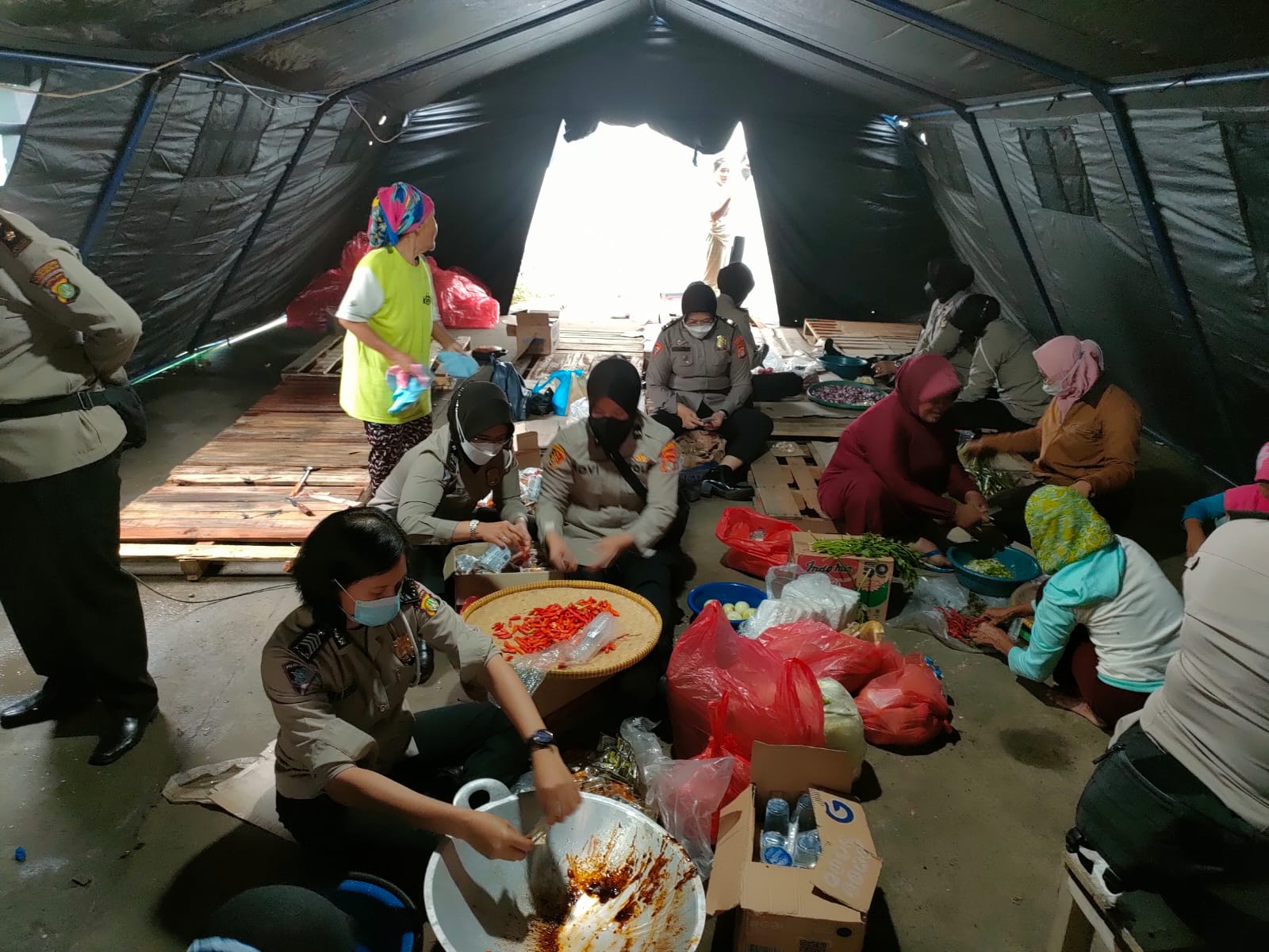 Berdasakan pantauan di dapur umum, anggota Polwan Polres Metro Tangerang Kota bersama Ibu – ibu PKK Desa Laksana, tengah menyiapkan makanan siap saji untuk 850 warga yang menjadi korban banjir. (Ayu)