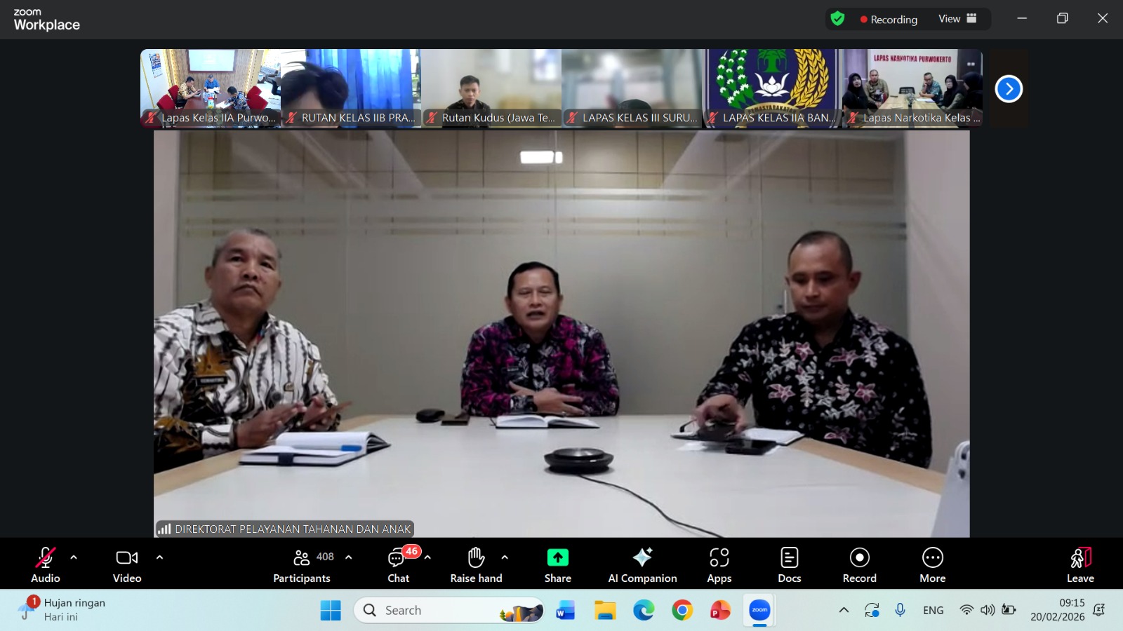 Purwokerto – Lembaga Pemasyarakatan Kelas IIA Purwokerto mengikuti kegiatan Diskusi Implementasi Berlakunya Kitab Undang-Undang Hukum Pidana (KUHP) dan Kitab Undang-Undang Hukum Acara Pidana (KUHAP) yang diselenggarakan oleh Direktorat Jenderal Pemasyarakatan melalui video teleconference Zoom, Jumat (20/02). Kegiatan ini diikuti oleh seluruh Kantor Wilayah Direktorat Jenderal Pemasyarakatan serta Unit Pelaksana Teknis Pemasyarakatan di seluruh Indonesia sebagai upaya menyamakan pemahaman terhadap regulasi hukum pidana terbaru.