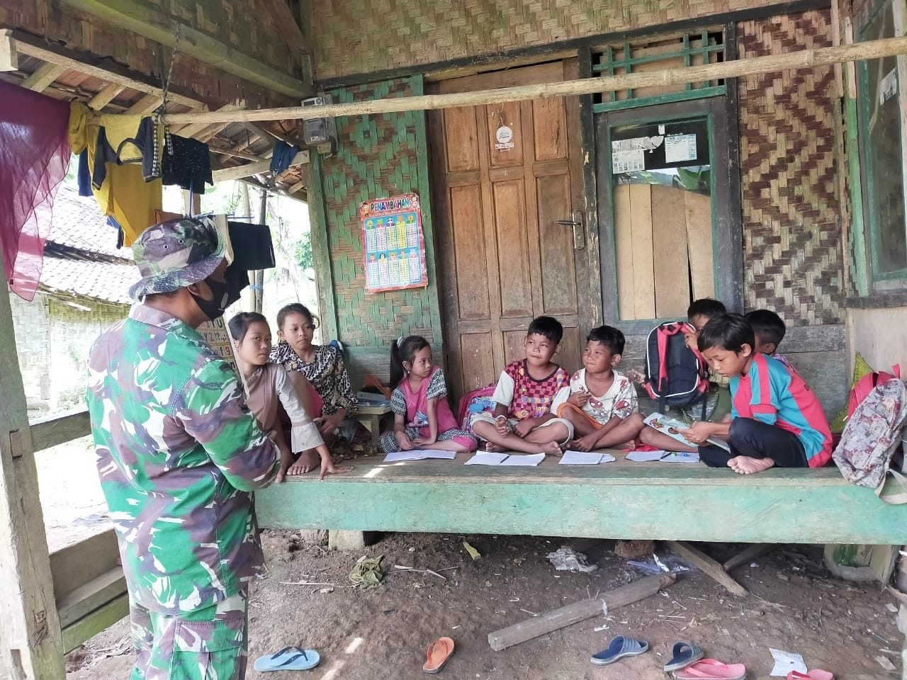 LEBAK – Pada program TNI Manunggal Membangun Desa (TMMD) ke 110 Kodim 0603 Lebak selain pelaksanaan pengerjaan fisik yakni pembukaan jalan desa Jayasari menuju Gununganten Kecamatan Cimarga selebar 8 meter dan panjang 6 kilo meter, Satgas TMMD disela waktunya yang padat ternyata masih sempat meluangkan waktunya memberikan edukasi kepada anak-anak warga Kampung Leuwi Buled Desa Jayasari.