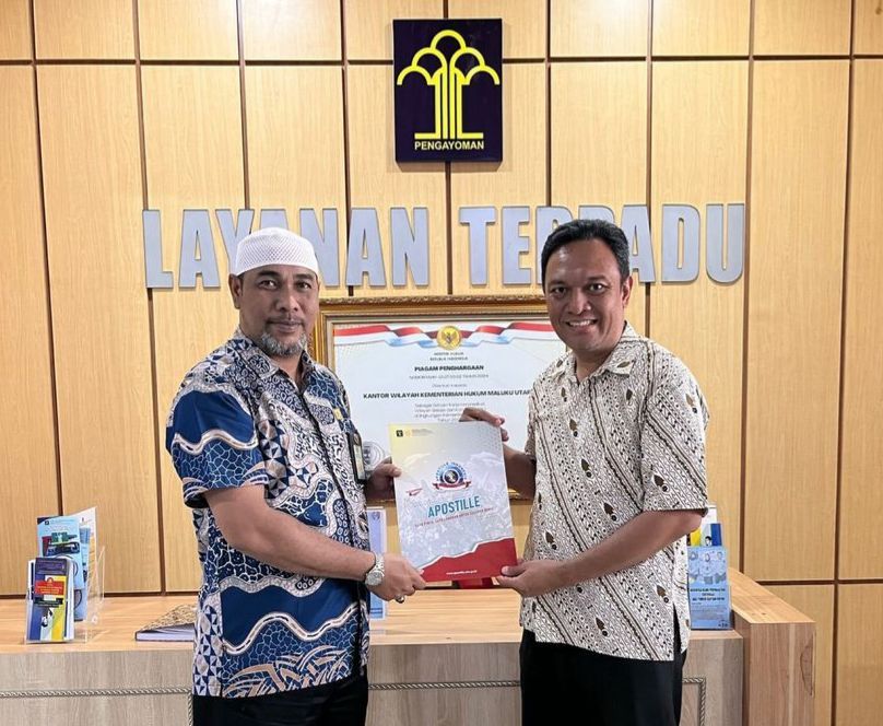 Ternate – Kantor Wilayah (Kanwil) Kementerian Hukum (Kemenkum) Maluku Utara (Malut) menyerahkan 2 dokumen apostille yaitu Decree of The President Director of The Endowment Fund for Education Agency, dan Financial Guarantee Letter kepada pemohon Muhammad Abdul Kahar.