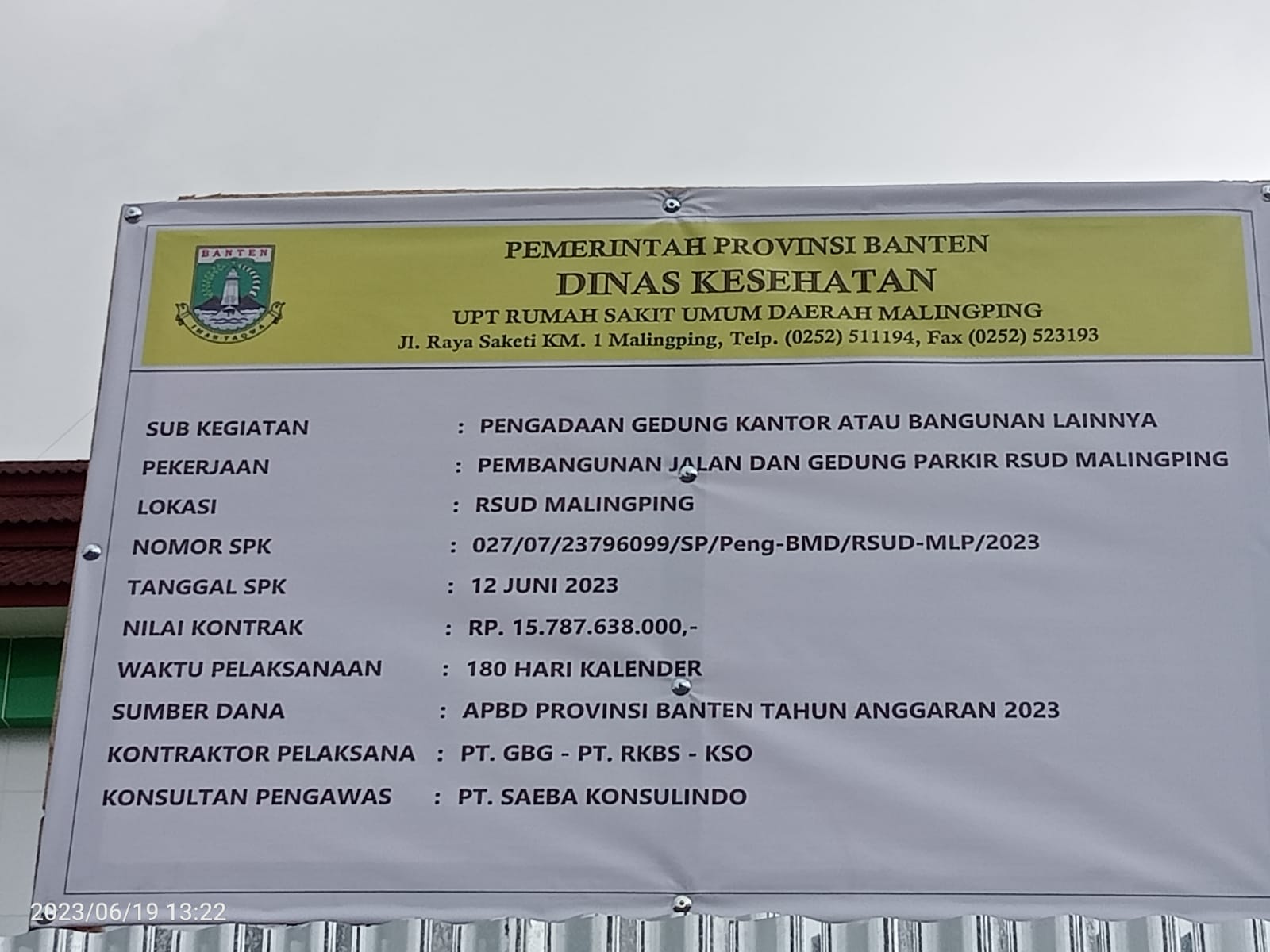 Pembangunan infrastruktur jalan dan gedung parkir di UPT Rumah Sakit Umum Malingping senilai 15.787.638.000 milyar bersumber dari APBD I TA. 2023 Provinsi Banten satuan kerja (satker) Dinas Kesehatan Provinsi Banten.