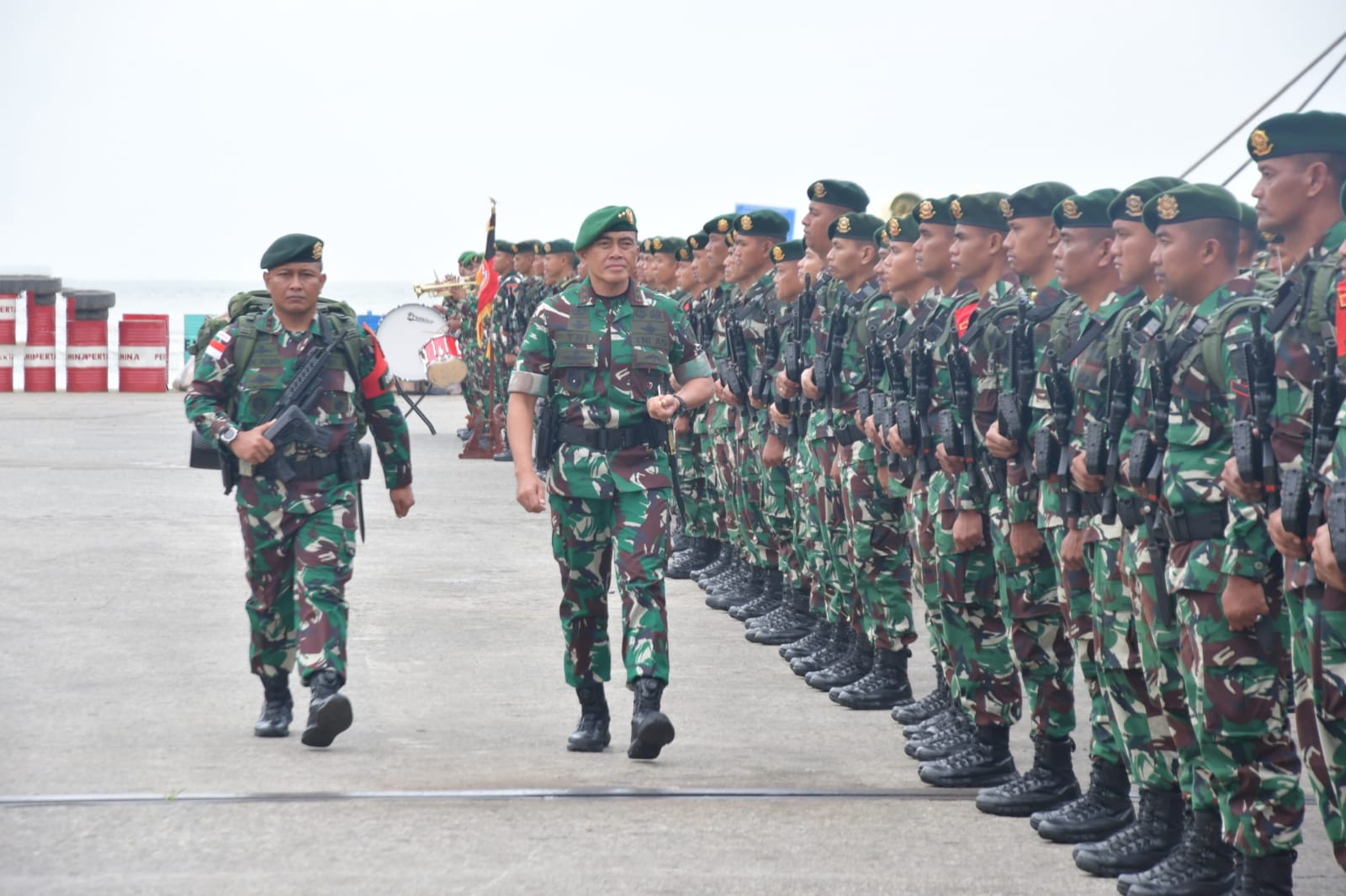 Balikpapan – Panglima Komando Daerah Militer (Kodam) VI/Mulawarman, Mayjen TNI Tri Budi Utomo, memimpin upacara penerimaan Satuan Tugas Pengamanan Perbatasan RI-Malaysia Yonarmed 11 Kostrad di Pelabuhan Semayang Balikpapan Kalimantan Timur. Upacara ini merupakan langkah awal bagi Satgas Pamtas dalam menjalankan tugasnya menjaga perbatasan RI-Malaysia, khususnya di wilayah Kalimantan Utara. Balikpapan, Selasa (20/08/24).