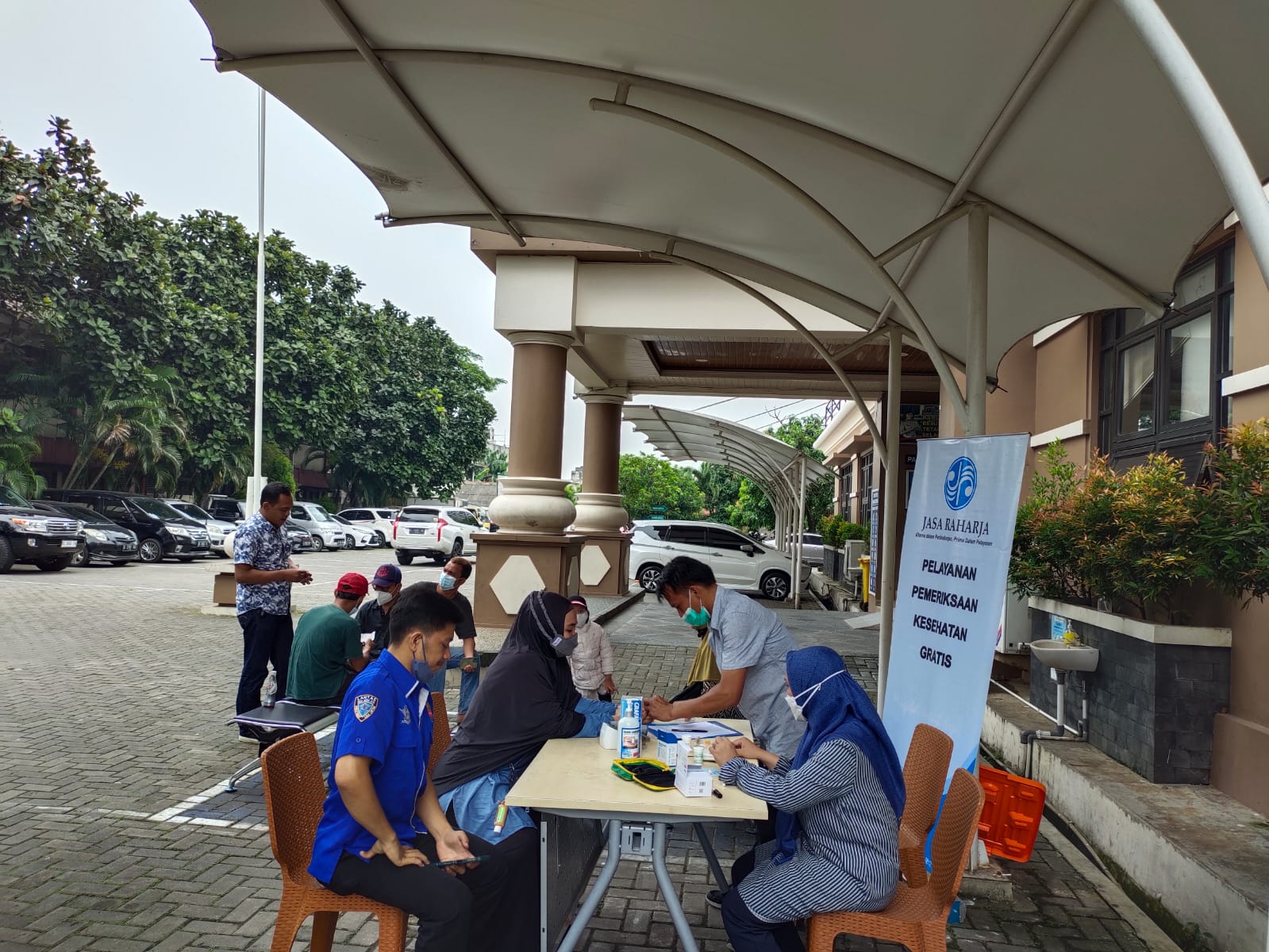 TANGERANG – Jasa Raharja Perwakilan Tangerang Cabang Banten menggelar kegiatan pemeriksaan dan pengobatan gratis di Samsat Ciledug Tangerang. Rabu (19/10).