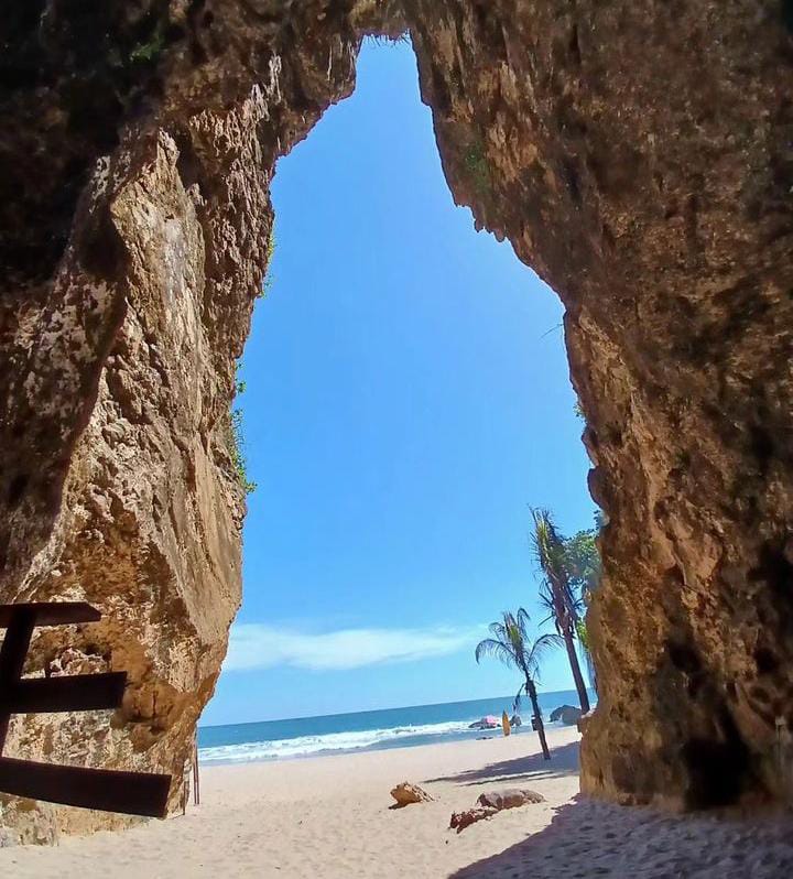 Pantai ini merupakan salah satu pantai yang unik dengan ciri khas goa besar yang ada pada area pantai.