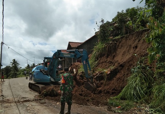 Serda Udin Syaefudin “ menerangkan bahwaLongsoran itu terjadi akibat curah hujan semalam yang begitu deras disertai angin dan awalnya evakuasi tanah ini menggunakan alat seadanya bersama masyarakat setelah dibersihkan secara manual tanah itu kembali longsor dan ia bersama Bhabinkamtibmas meminjam alat berat kepada pekerja jalan karena jalan raya Mancak kebetulan sedang di bangun “ tutur Serda Udin Syaefudin