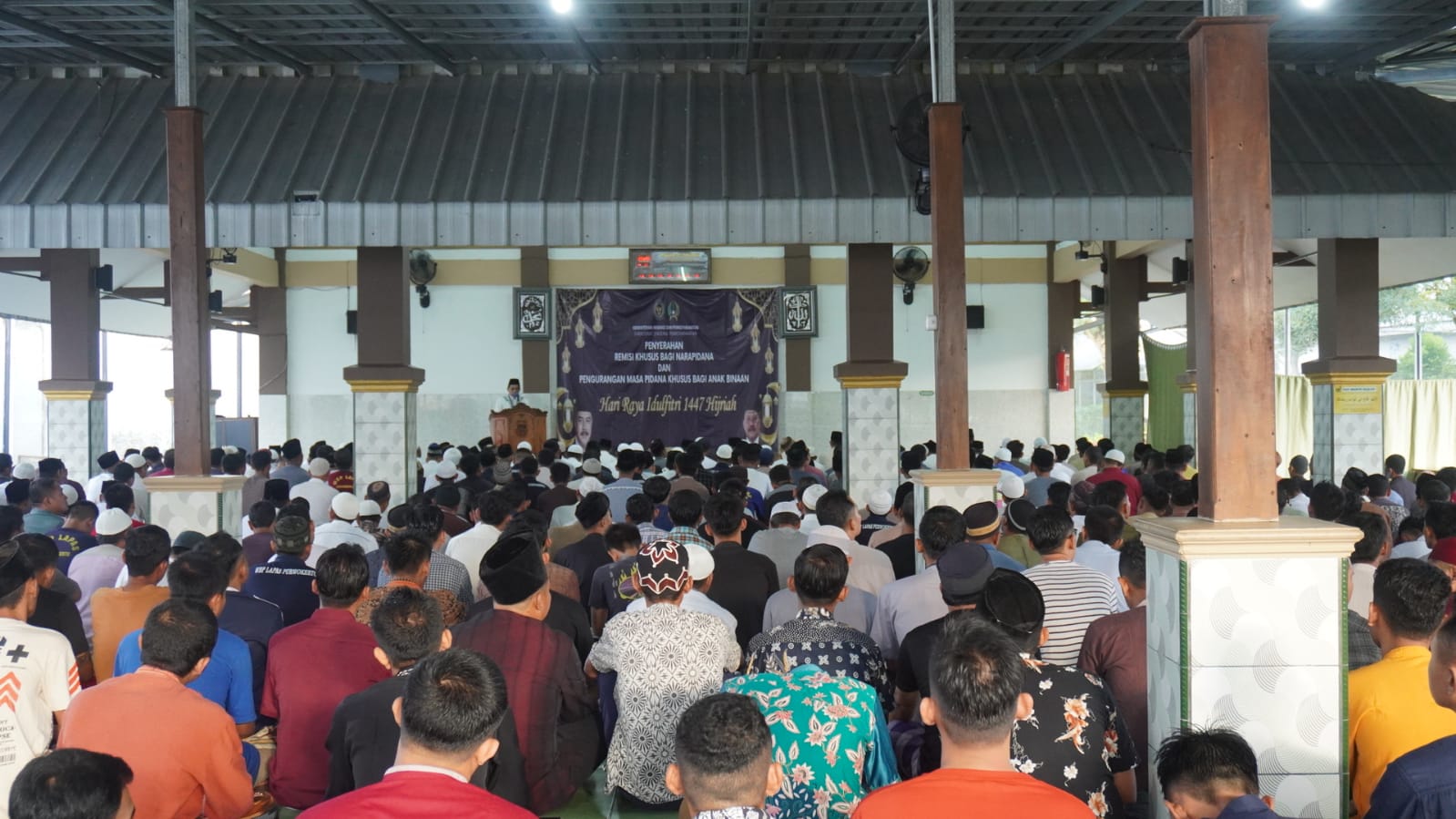 Lembaga Pemasyarakatan Kelas IIA Purwokerto melaksanakan Sholat Idul Fitri 1447 Hijriah yang dirangkaikan dengan penyerahan Surat Keputusan (SK) Remisi Khusus Hari Raya Idul Fitri Tahun 2026 bagi Warga Binaan, Sabtu (21/3/2026). Bertempat di Masjid At-Taubah, kegiatan diikuti oleh petugas dan seluruh Warga Binaan yang beragama Islam dengan penuh khidmat dan tertib.
