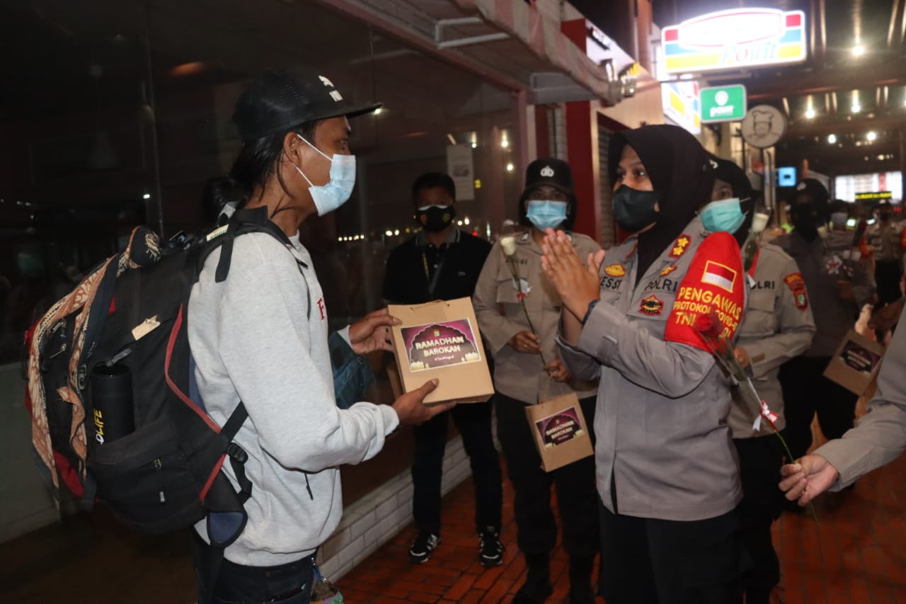 Tangerang -Memperingati hari Kartini tahun 2021, Polisi Wanita Polresta Bandara Soekarno-Hatta memberikan makan sahur gratis kepada warga (penumpang pesawat.red) di terminal 2 Bandara Soetta, Rabu (21/4/2021) sejak pukul 03.00 wib pagi