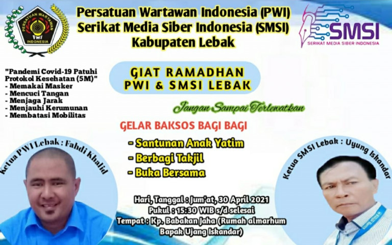 Siberindo.co – Persatuan Wartawan Indonesia (PWI) Kabupaten Lebak bersama Serikat Media Siber Indonesia (SMSI) Kabupaten Lebak akan menggelar buka puasa bersama (Bukber) sekaligus Bhakti sosial (Baksos) berupa santunan untuk anak yatim piatu di Kecamatan Malingping, Kabupaten Lebak pada tanggal 30 April 2021 dengan tema “Indahnya Berbagi Di Bulan Yang Suci”.