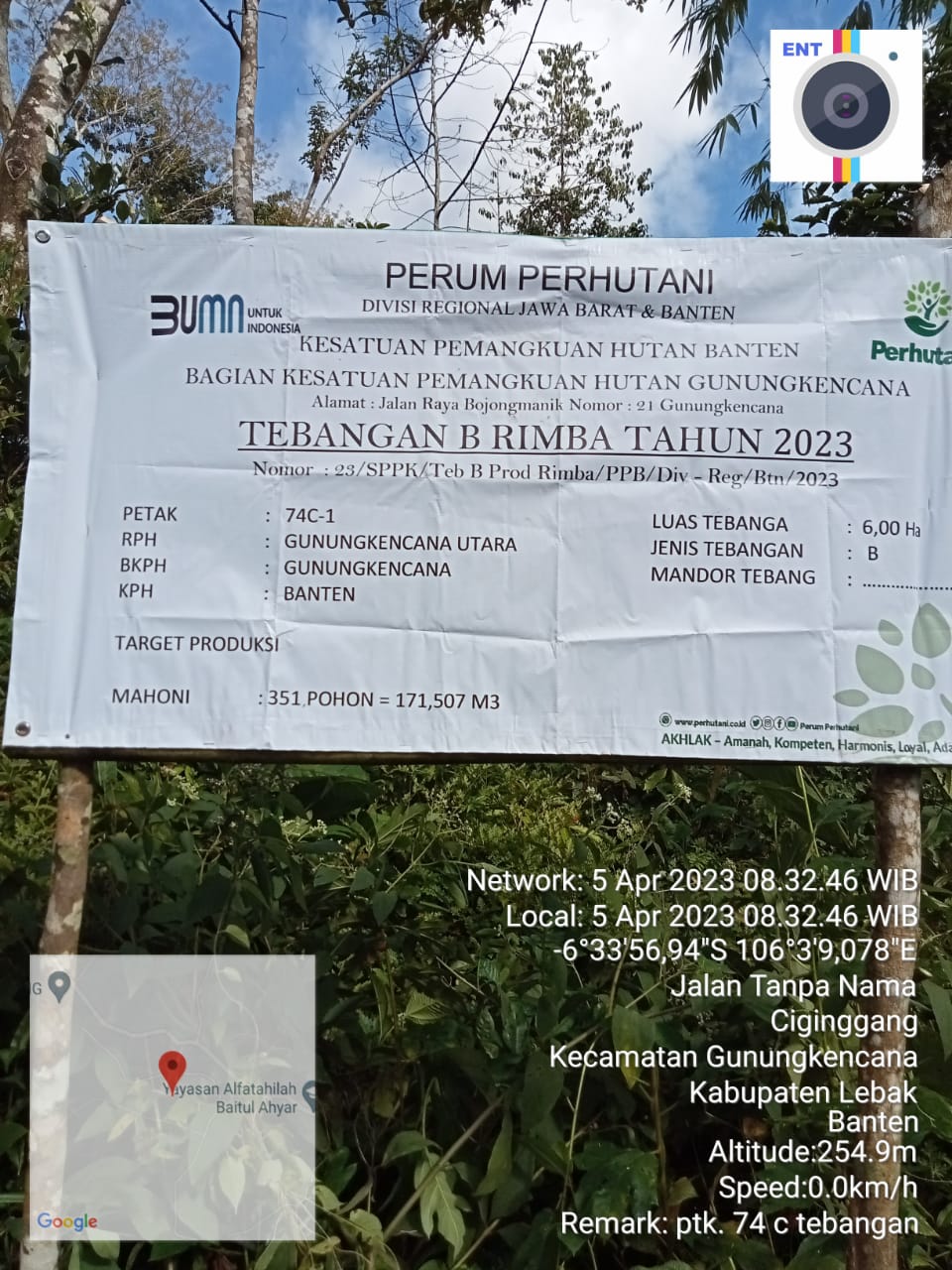 Bagian Kesatuan Pengelolaan Hutan (BKPH) Gunungkencana melalui Resort Pengelolaan Hutan (RPH) Gunungkencana utara melakukan penebangan pohon mahoni Petak 74C-1, seluas 6 Ha, sekitar 351 batang dan atau sekitar 171,507 Meter kubik dengan tebangan jenis B, yang berlokasi di wilayah Ciginggang, Kecamatan Gunungkencana, Kabupaten Lebak.
