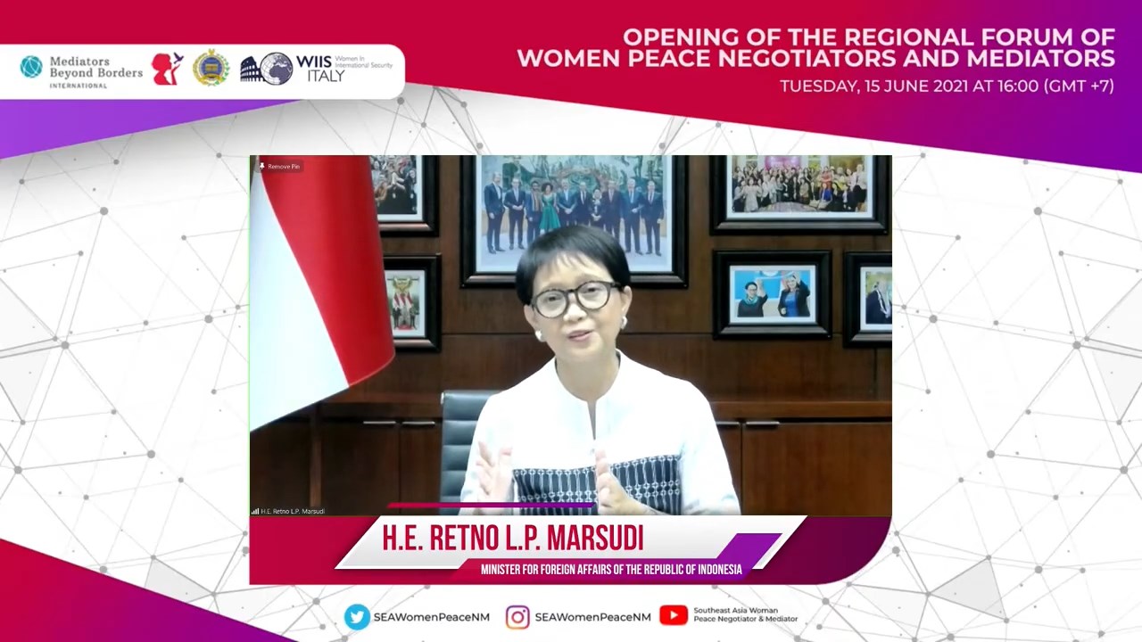 Seperti dilansir dari situs kemlu.go.id, Dihadapan sekitar 450 peserta, Menlu RI membuka kegiatan Regional Forum of Women Peace Negotiators and Mediators yang berlangsung 15 – 24 Juni 2021.