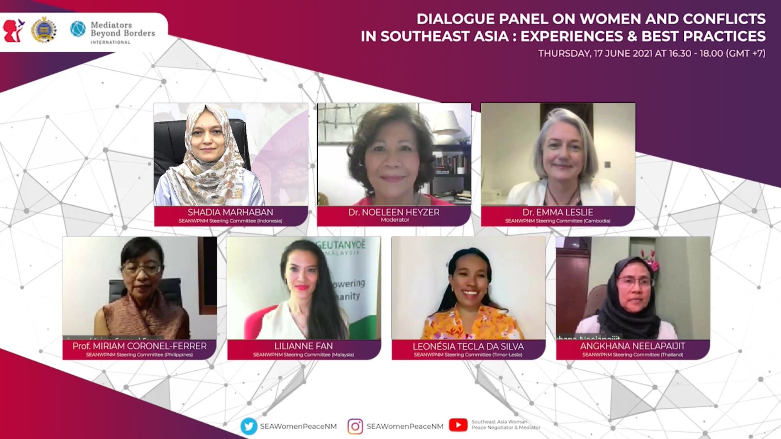 Dialogue Panel on Women and Conflict in Southeast Asia: Best Practices and Lesson Learned merupakan bagian dari rangkaian Regional Forum of Women Peace Negotiators and Mediators yang diselenggarakan Kementerian Luar Negeri bekerja sama dengan SEANWPNM pada tanggal 15-24 Juni 2021.