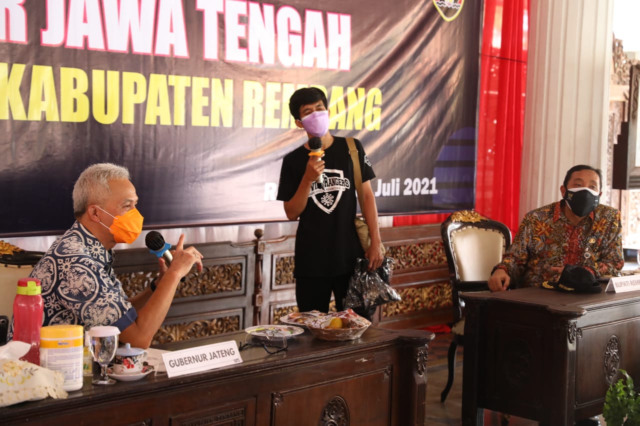 REMBANG – Sekelompok pemuda menarik perhatian Gubernur Jawa Tengah, Ganjar Pranowo saat menggelar Rembug Desa di Pendapa Kabupaten, Rabu (21/7/2021). Mereka terlihat berlalu lalang di lokasi acara sambil mengenakan kaos hitam.
