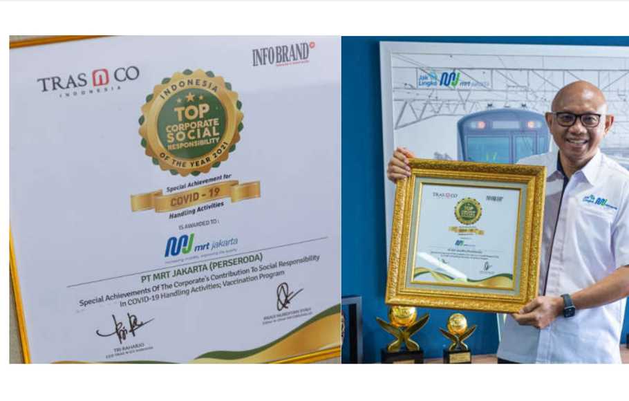 PT MRT Jakarta (Perseroda) menerima penghargaan Top Corporate Social Responsibility of the Year 2021: Special Achievement for Covid-19 Handling Activities dari TRAS N CO Indonesia dan INFOBRAND.ID.