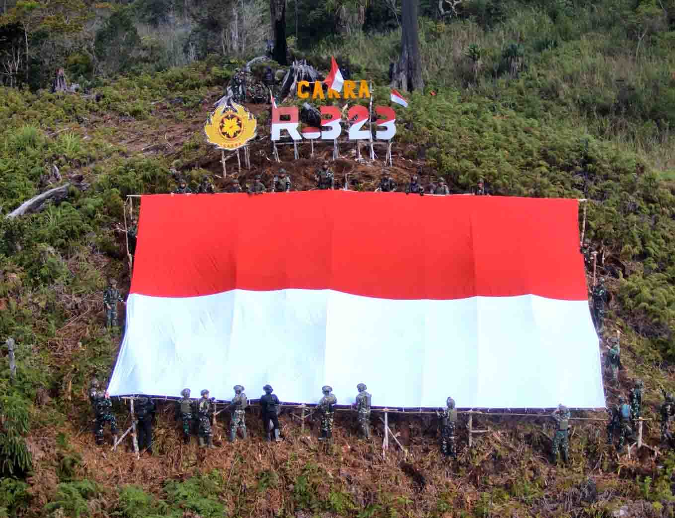 Omukia Puncak, – Satuan Tugas Batalyon Infanteri (Satgas Yonif) Raider 323/Buaya Putih Kostrad, salah satu Satuan Jajaran Komando Operasi HABEMA di Papua, di bawah pimpinan Letkol Inf Tri Wiratno,  memimpin langsung kegiatan pembentangan Bendera Merah Putih berukuran raksasa dalam rangka memperingati Hari Kemerdekaan ke-79 Republik Indonesia di Bukit Cakra yang masuk wilayah Kampung Eromaga, Distrik, Selasa (20/8/2024).