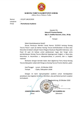 Secara resmi Karang Taruna Kabupaten Lebak sudah melayangkan surat permohonan audiensi nomor 015/KT.LBK/X/2020. Hal itu dibenarkan oleh juru bicara Ketua Karang Taruna Kabupaten Lebak.