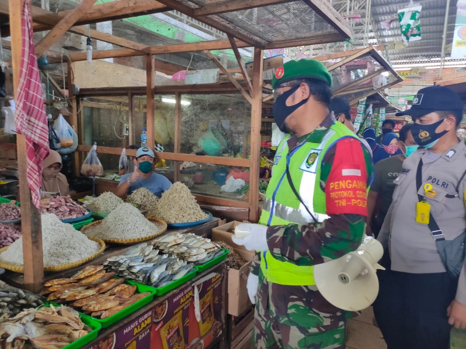 CILEGON – Koramil 2301/Cilegon Kodim 0623/Cilegon menghimbau pada masyarakat untuk tetap menjaga Protokol kesehatan ( Prokes )saat berbelanja di Pasar Kelapa Kecamatan Cilegon Kota Cilegon Banten, Sabtu ( 21/11/2020)