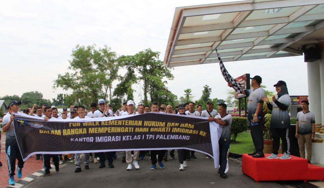 Palembang,  – Ratusan pegawai dilingkungan Kantor Wilayah Kementerian Hukum dan HAM Sumatera Selatan (Kanwil Kemenkumham Sumsel) berpartisipasi dalam kegiatan Fun Walk yang digelar oleh Kantor Imigrasi Kelas I TPI Palembang, Sabtu (20/1). Kegiatan ini merupakan salah satu rangkaian peringatan Hari Bhakti Imigrasi ke-74 yang jatuh pada tanggal 26 Januari.