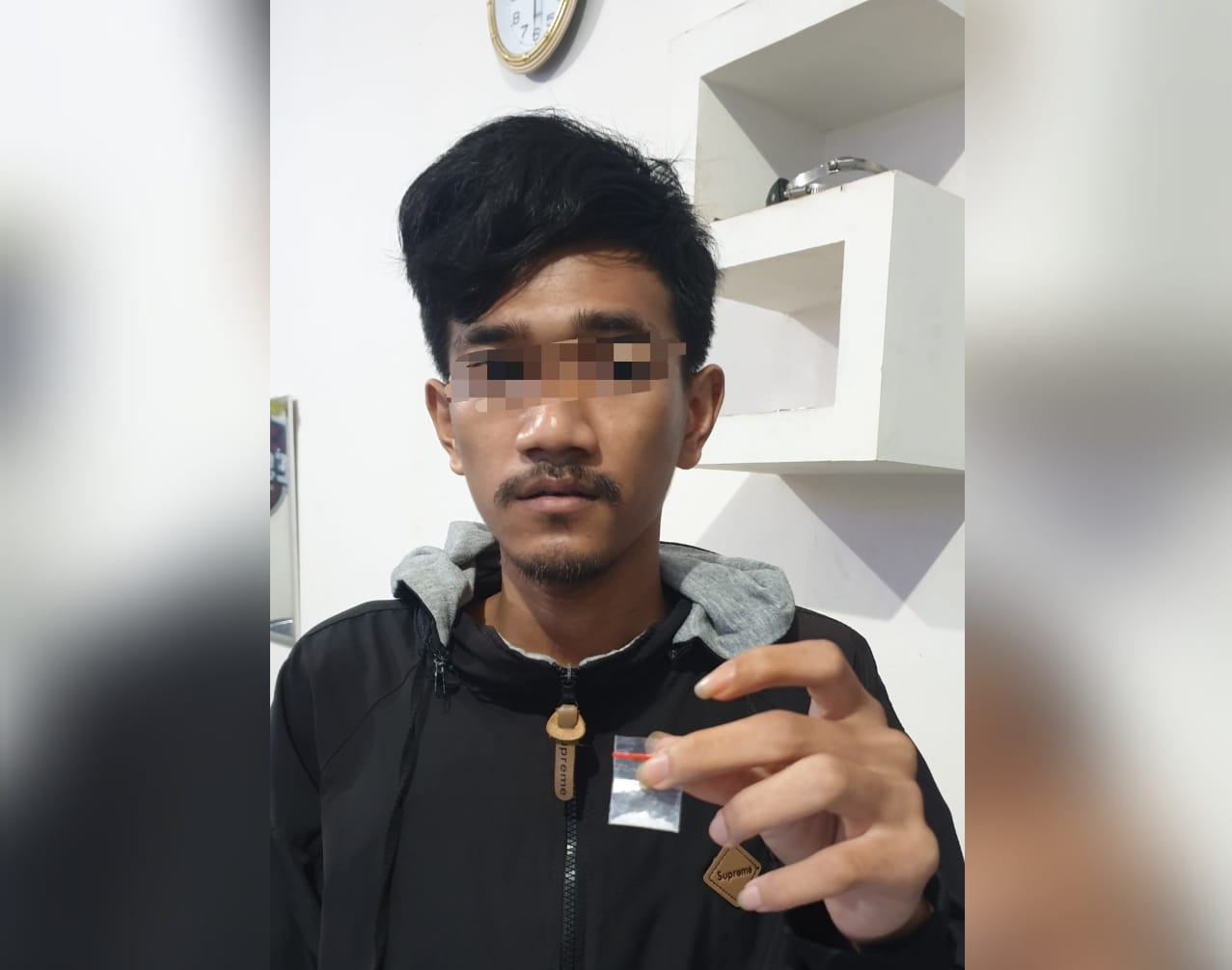 Wahyu melanjutkan, pada saat ditangkap, dari tangan tersangka didapati narkotika jenis sabu yang berada di dalam dompet yang dikalungkan di leher tersangka. Selain itu, di kantung celana tersangka juga didapati 1 bungkus narkotika jenis sabu yang dimasukan ke dalam bungkus rokok.
