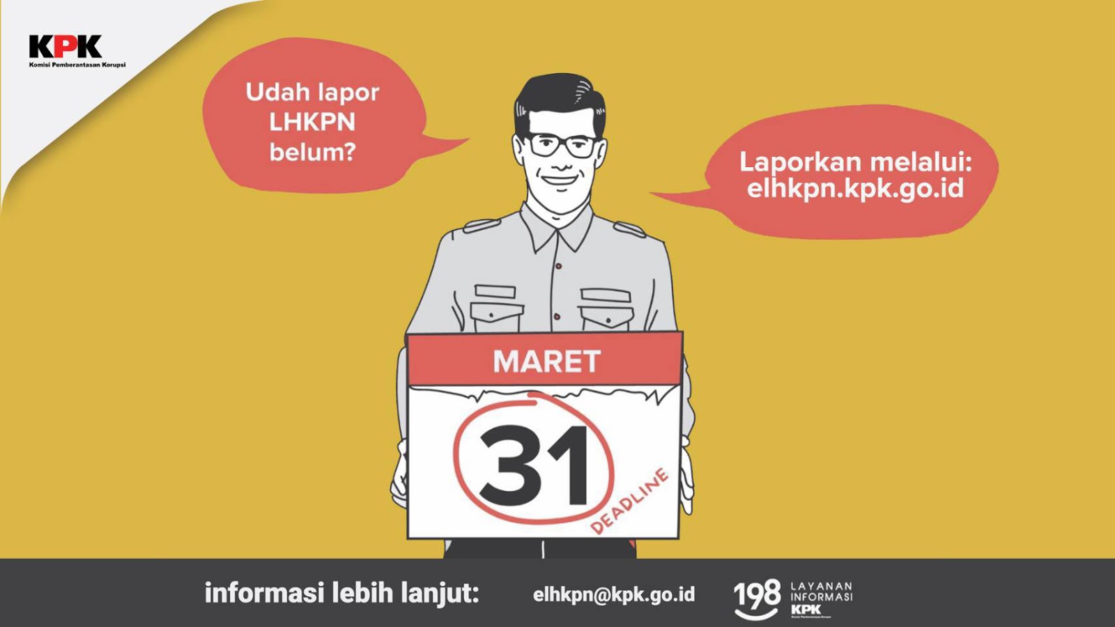 JAKARTA – Sebelum batas akhir pelaporan pada 31 Maret 2021 mendatang, Komisi Pemberantasan Korupsi (KPK) kembali mengingatkan seluruh Penyelenggara Negara untuk segera menyampaikan Laporan Harta Kekayaan Penyelenggara Negara (LHKPN)-nya, masyarakat pun diminta turut serta mengingatkan dan mengawasi proses ini.