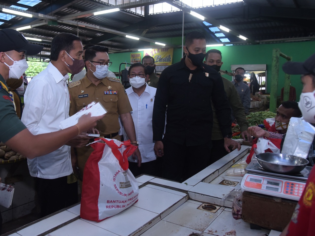 Presiden RI Joko Widodo (Jokowi), Kamis (21/04/2022), membagikan bantuan sosial (bansos) bagi penerima manfaat dan pedagang di sejumlah pasar di Kabupaten Bogor, Jawa Barat.
