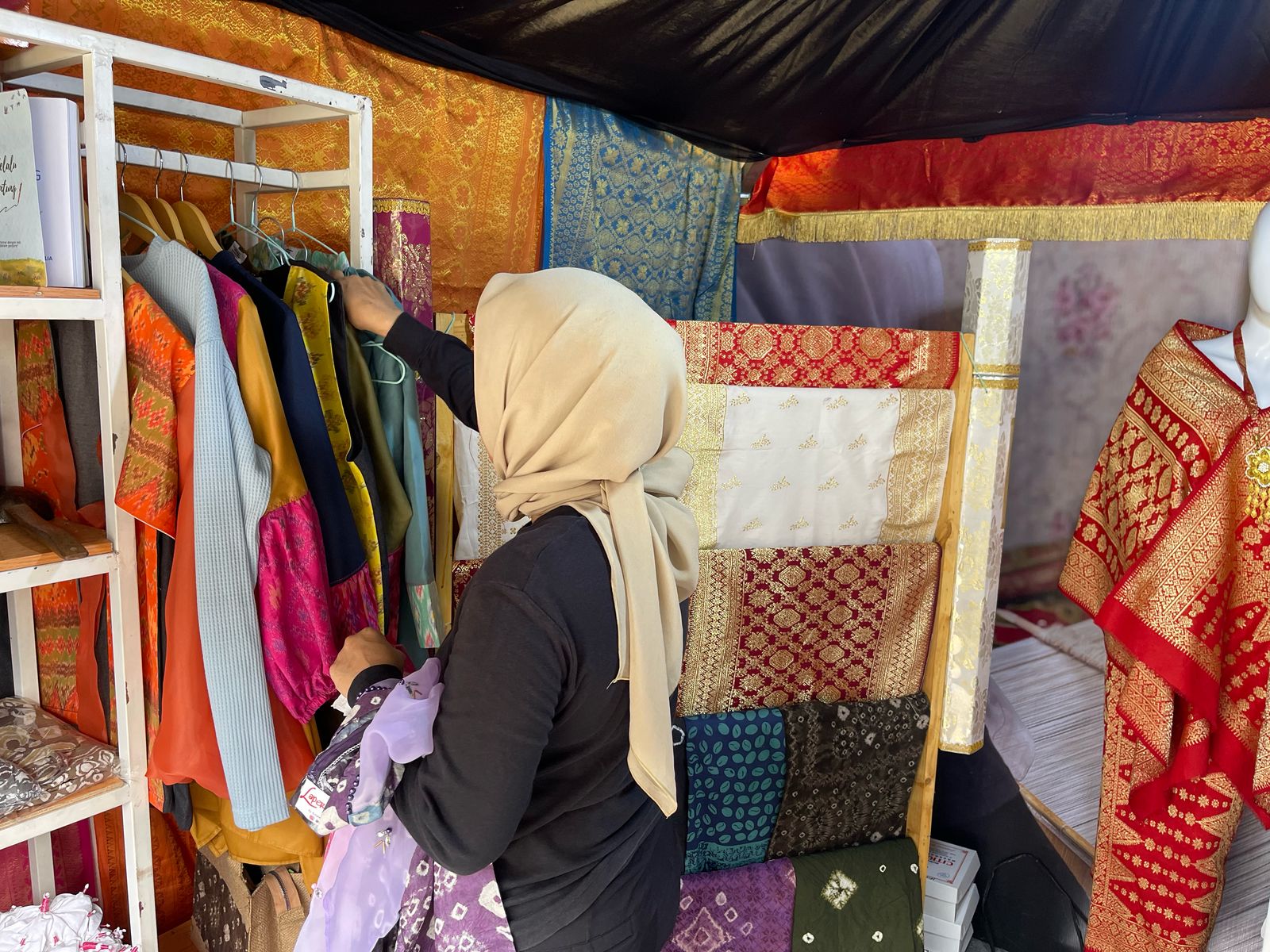 Produk Karya Warga Binaan Lapas Perempuan Palembang Berada di Stand Kanwil Ditjen Pas Sumatera Selatan dengan menampilkan kain Blongket Palembang, sebuah kain tenun dengan motif-motif terinspirasi dari keindahan Songket Palembang, yang menjadi daya tarik utama dan membanggakan.