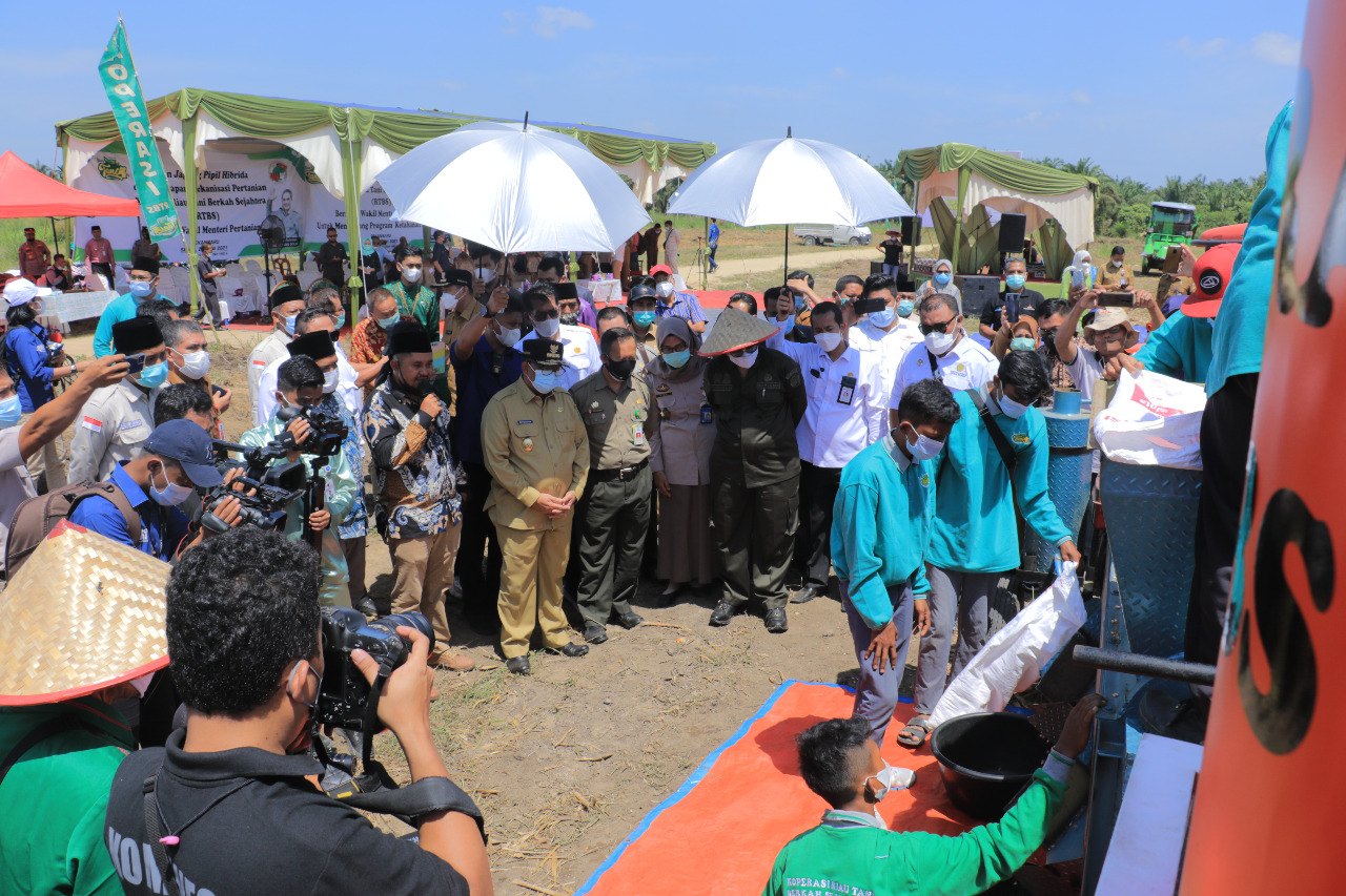Kemudian, rombongan menyaksikan panen raya jagung Pipil Hibrida secara mekanis atau menggunakan mesin oleh Koperasi Riau Tani Berkah Sejahtera (RTBS).