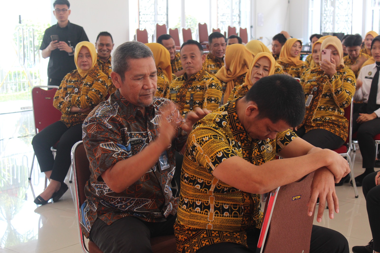 Suasana pelatihan semakin interaktif ketika pegawai mencoba mempraktikkan terapi sehat tersebut bersama rekan di sebelahnya. Mereka saling membantu melakukan gerakan sederhana yang dicontohkan oleh Kakanwil, sehingga suasana terasa lebih akrab dan menyenangkan.