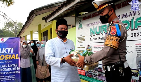 Dalam kegiatan baksos tersebut Sat Lantas Polres Lebak memberikan Sembako yang diterima langsung oleh pimpinan Ponpes salafi Nurwidia, Kyai Muhidin, S.Ag.