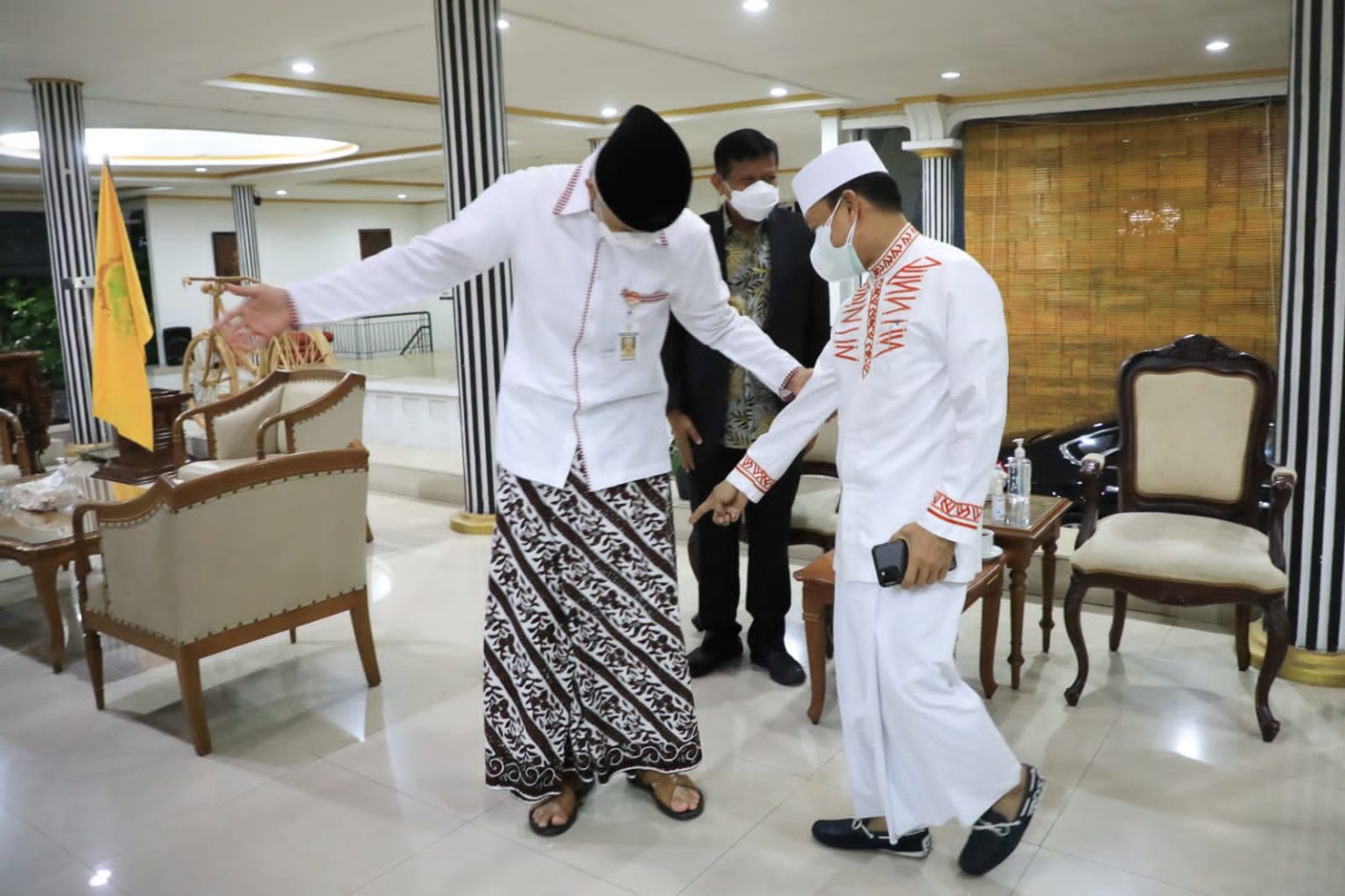 SEMARANG – Sarung batik yang dikenakan Gubernur Jawa Tengah Ganjar Pranowo menarik perhatian Ustaz Das’ad Latif saat bersilaturahmi di Rumah Dinas Puri Gedeh, Jumat (22/10/2021). Ustaz asal Sulawesi Selatan itu memuji sarung yang diproduksi santri dari Solo tersebut.
