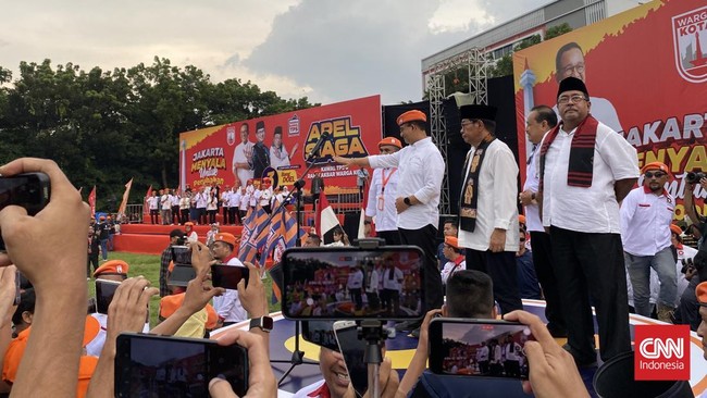 Ribuan pendukung sudah memadati lokasi kampanye. Mereka kompak mengenakan topi oranye bertuliskan “Warga Kota” dengan logo Monas berwarna merah.