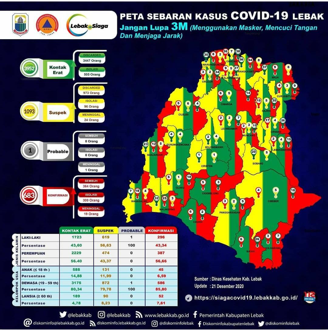 SIBERINDO.CO-Kasus terkonfirmasi Covid-19 di Kabupaten Lebak terus melonjak, terhitung Senin (21/12) mencapai 683 orang. Padahal, segala cara dan upaya telah dilakukan pemerintah daerah diantaranya dengan menerbitkan Perbup dan dirubah menjadi perda. Bahkan, penerapan pembatasan sosial berskala besar (PSBB) telah dijalankan dengan pengetatan segala kegiatan baik di masyarakat, lembaga maupun kegiatan pemerintahan.