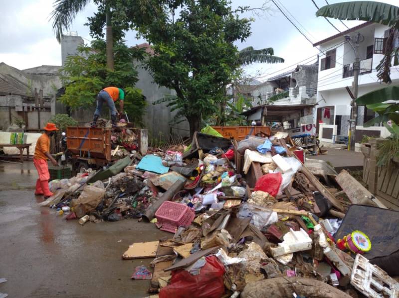 Beberapa lokasi Banjir di Kota Tangerang telah berangsur surut. Jajaran Pemkot Tangerang pun bergerak cepat dengan melakukan pembersihan sampah pasca banjir.