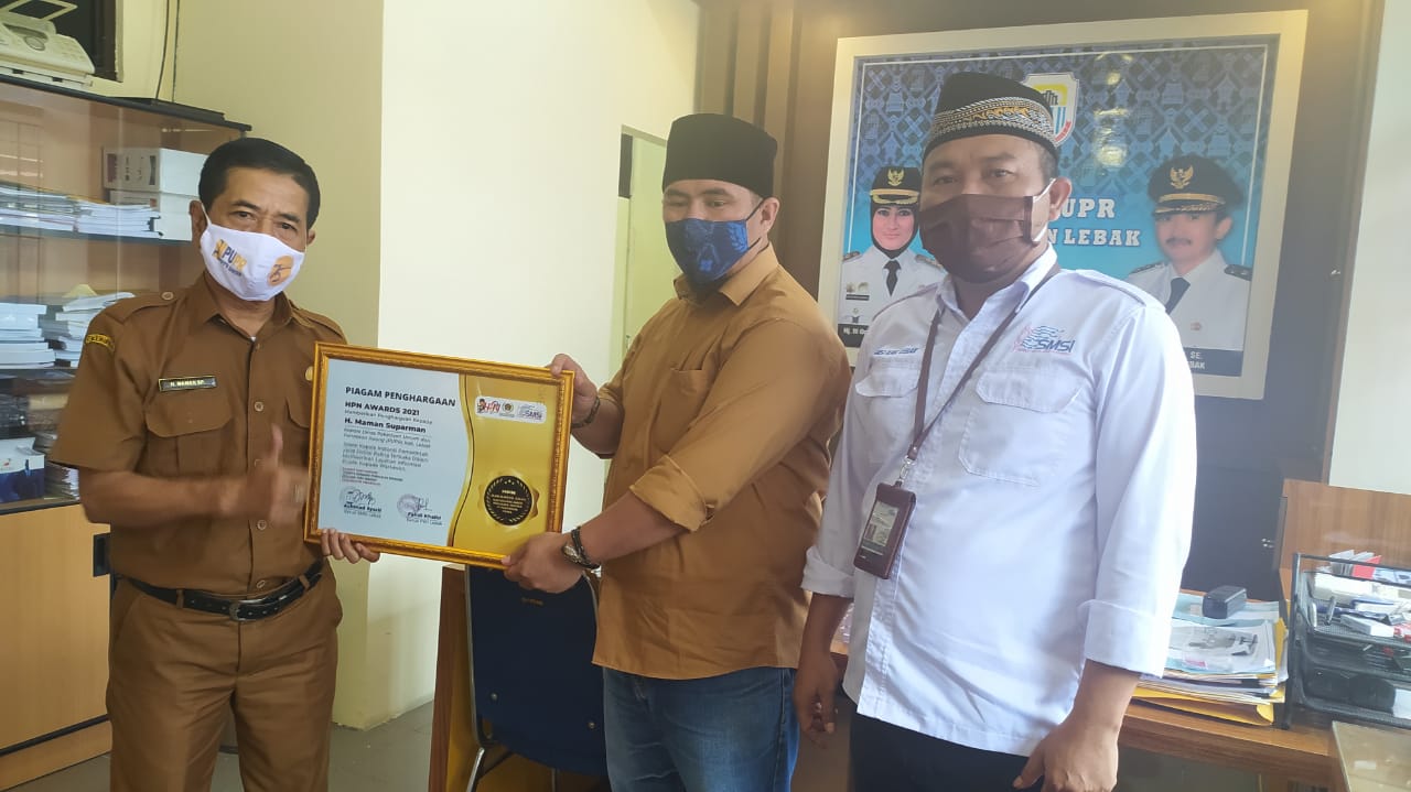 Penghargaan diserahkan kepada H. Maman SP oleh Ketua PWI Lebak, Fahdi Khalid dan Ketua SMSI Lebak, Achmad Syarif, didampingi beberapa pengurus, Selasa (23/2/2021) bertempat di ruangan Kadis PUPR Lebak.