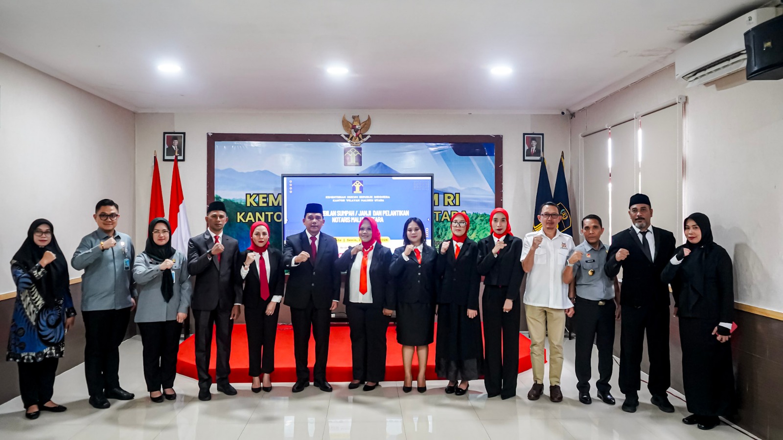 Ternate – Kepala Kantor Wilayah (Kakanwil) Kementerian Hukum (Kemenkum) Maluku Utara (Malut), Budi Argap Situngkir (BAS) melantik dan mengambil sumpah jabatan enam (6) notaris baru wilayah Provinsi Maluku Utara di Aula Gamalama Kantor Wilayah (Kanwil) Kementerian Hukum (Kemenkum) Maluku Utara (Malut), Senin (23/2/2026).