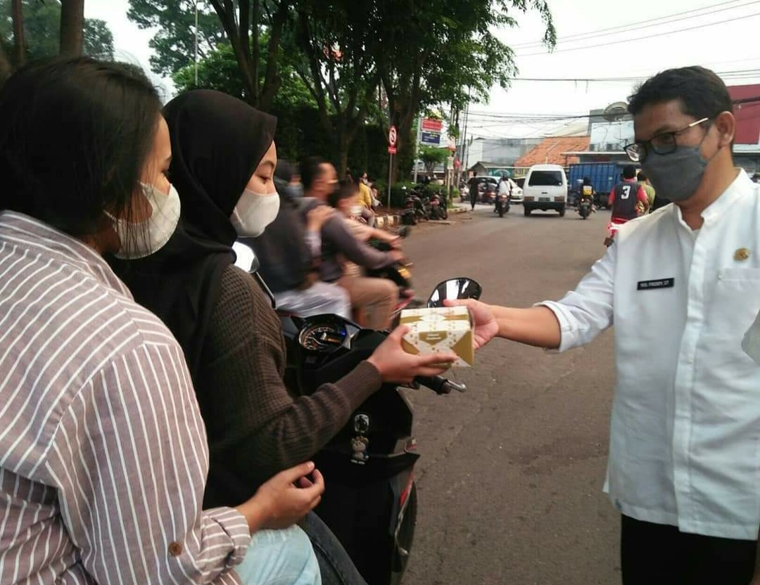 Camat Karang Tengah Edy Mahyudi turun langsung berbagi ke warga yang melintas dijalan Raya Metro Permata Kelurahan Karang Mulya.