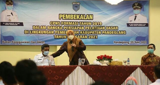 Pandeglang – Sebanyak 51 orang Calon Pegawai Negeri Sipil (CPNS) formasi 2019 mengikuti pembekalan Pelatihan Dasar (Latsar). Bupati Pandeglang Irna Narulita berharap para CPNS ini bisa memberikan kontribusi untuk daerah. “Disini titik awal anda menjadi pelayan masyarakat, anda terpilih dari sekian yang ikut seleksi kami yakin bisa memberikan perubahan untuk daerah,” demikian dikatakan Bupati Irna Narulita pada saat memberikan arahan pada acara Latsar, Rabu (23/6/2021) di Hotel Rizki.