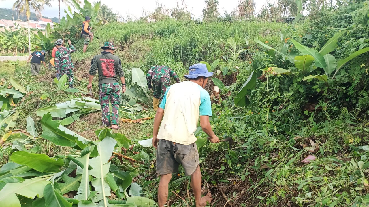 Sebagai wujud kemanunggalan TNI dengan rakyat, anggota Koramil 1502/Kadugede, Kodim 0615/Kuningan melaksanakan kegiatan Karya Bhakti membersihkan rumput disekitar tempat penyimpanan air/embung di Desa Windujanten, Kecamatan Kadugede, Kabupaten Kuningan, Kamis (23/7/2020).