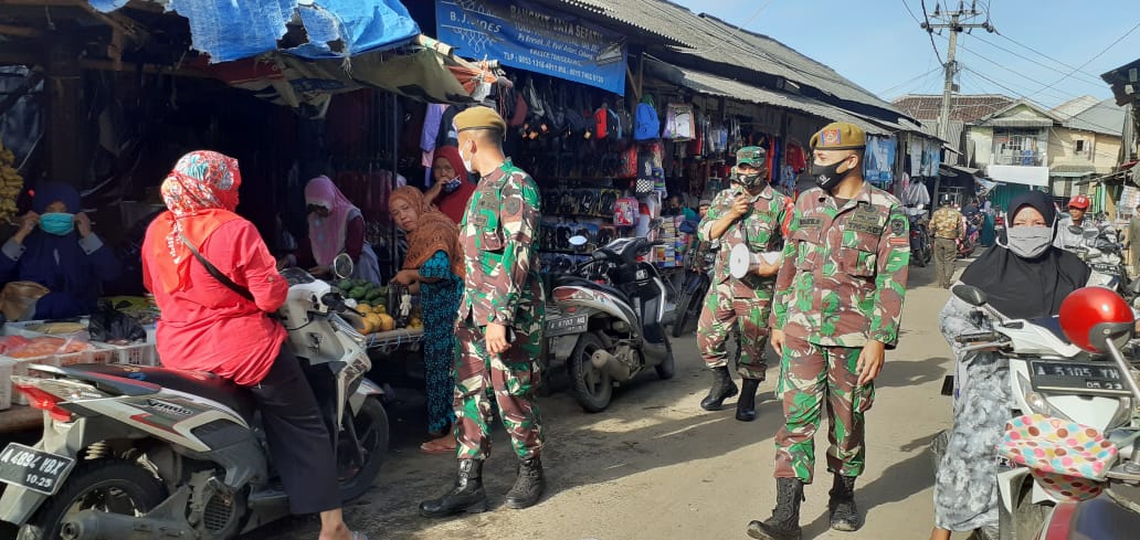 Siberindo.co – Mengantisipasi menumpuknya pengunjung pasar tradisional Mauk, Koramil 09/Mauk menerapkan new normal dengan Penegakan Disiplin Mematuhi Protokol Kesehatan, Rabu (23/12/2020).