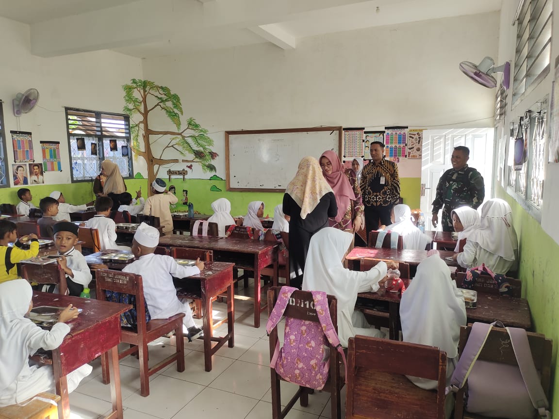 Para guru dan siswa tampak senang dan bahagia dengan adanya pembagian makanan bergizi gratis tersebut, terlebih menu makanannya beragam seperti ayam, ikan, sayur, nasi, buah, dan air minum.