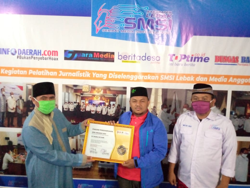 Deden M Fatih usai menerima penghargaan Hari Pers Nasional (HPN) Award 2021 dari Persatuan Wartawan Indonesia (PWI) dan Serikat Media Siber Indonesia (SMSI) kabupaten Lebak mengatakan tak menyangka akan mendapatkan penghargaan itu.