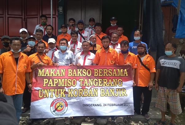 KOTA TANGERANG – Paguyuban Pedagang Mie dan Bakso (PAPMISO) Kota Tangerang, yang memiliki 300 anggota di seluruh wilayah Kota Tangerang melakukan bakti sosial yang difasilitasi oleh Komonitas GRANDONG dan Perguruan Silat SH TERATE Cabang Jatiuwung Periuk, dengan menyediakan ribuan mangkok bakso yang dibagikan kepada para korban Banjir di wilayah Kecamatan Priuk, Kota Tangerang Provinsi Banten ,Rabu (24/2/2021) Dikutip Bungasbanten.id – Group siberindo.co