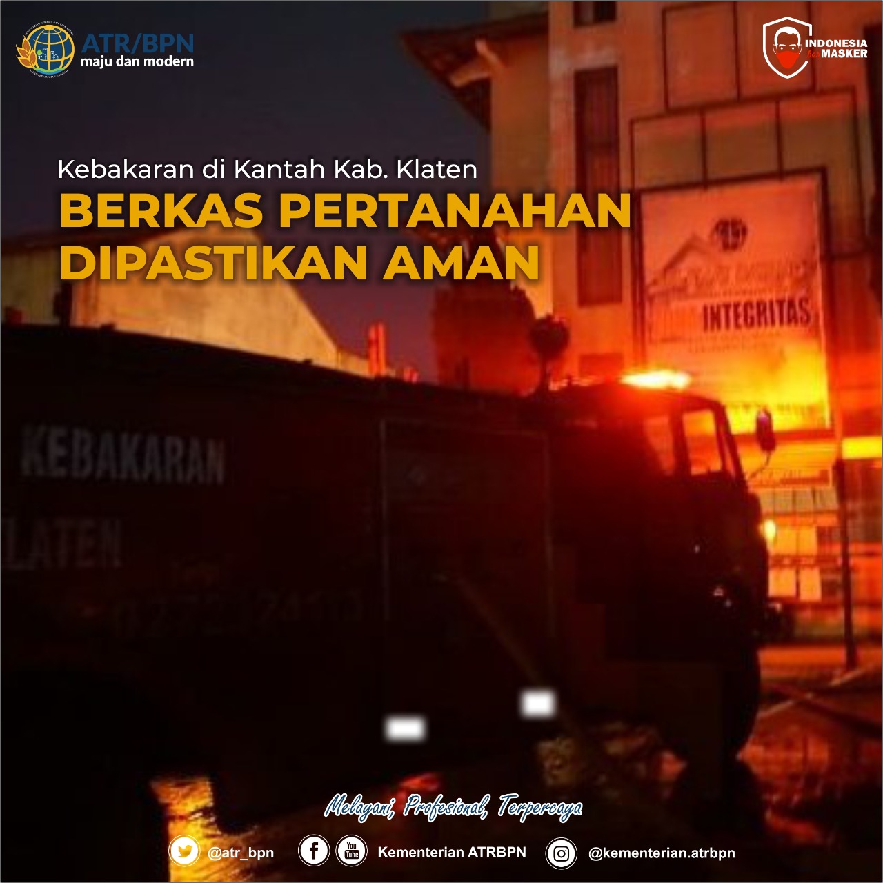 Kepala Kantor Pertanahan Kabupaten Klaten menegaskan bahwa dalam bencana kebakaran ini Buku Tanah dan Warkah aman dan tidak ada yang terbakar karena kebakaran terjadi di ruang komputer penggambaran di lantai 2, sedangkan Warkah dan Buku Tanah di lantai 1, dan surat ukur sudah bergabung di buku tanah dengan kondisi aman.