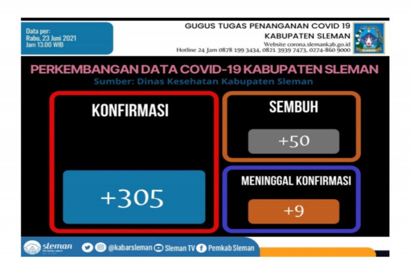 Sleman – Satuan Tugas (Satgas) Penanganan Covid-19 Kabupaten Sleman, Daerah Istimewa Yogyakarta mencatat terdapat penambahan kasus konfirmasi positif Covid-19 sebanyak 305 kasus pada Rabu 23 Juni 2021 sehingga total kasus di wilayah setempat mencapai sebanyak 20.317 orang.