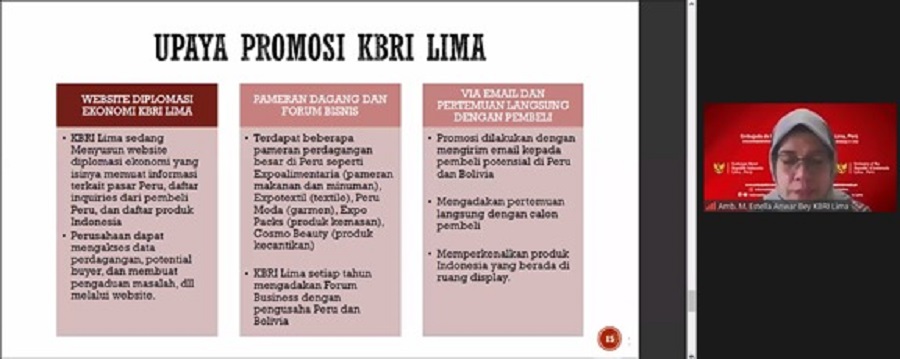 Di akhir paparan, Dubes Estella menekankan bahwa KBRI Lima siap mendukung UMKM Indonesia untuk masuk ke pasar Peru.